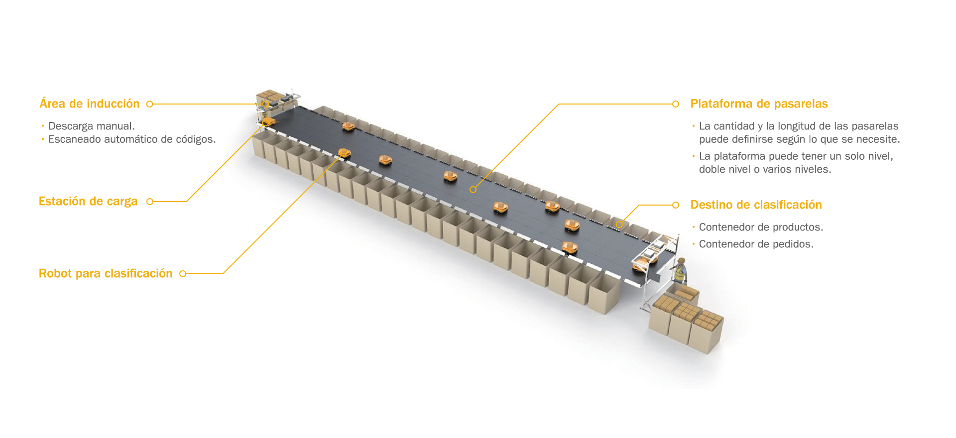 Adecuado para preparación de pedidos, clasificación de paquetes y otros escenarios relacionados. Según los requisitos de clasificación de paquetes y preparación de pedidos, el sistema puede aumentar o disminuir la cantidad de robots y rampas según sea necesario.