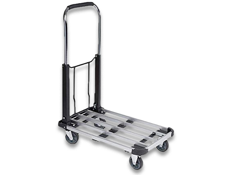 - Tiene una manija rebatible y cuatro ruedas de goma.