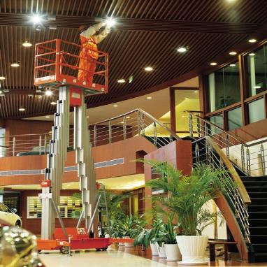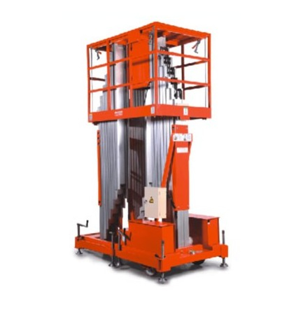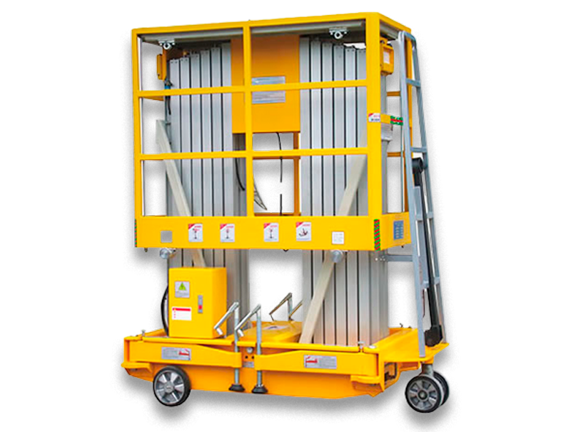 Las plataformas móviles AWP de Noblelift sirven para trabajar en altura. Alcanzan 6, 8, 10 Y 12 metros, según el modelo. Este modelo tiene un mástil doble, para elevar a dos operarios.