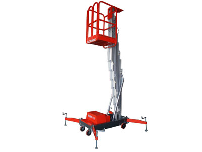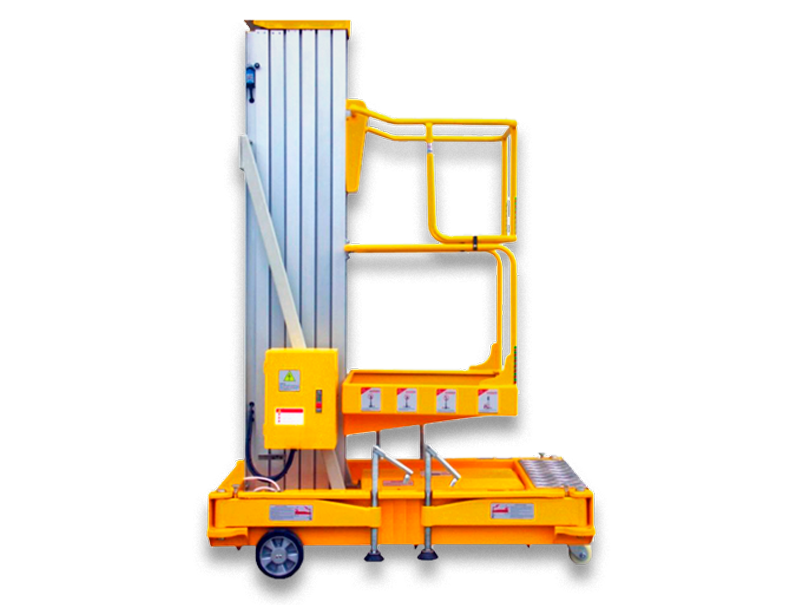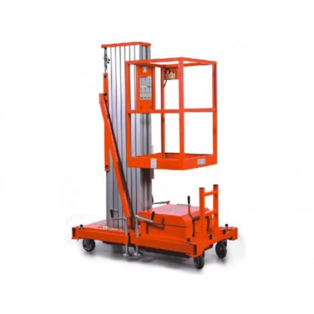 Las plataformas móviles AWP de la marca Noblelift sirven para trabajar en altura. Alcanzan 6, 8, 10 Y 12 metros, según el modelo. Este modelo tiene un mástil simple, para transportar a un solo operario.