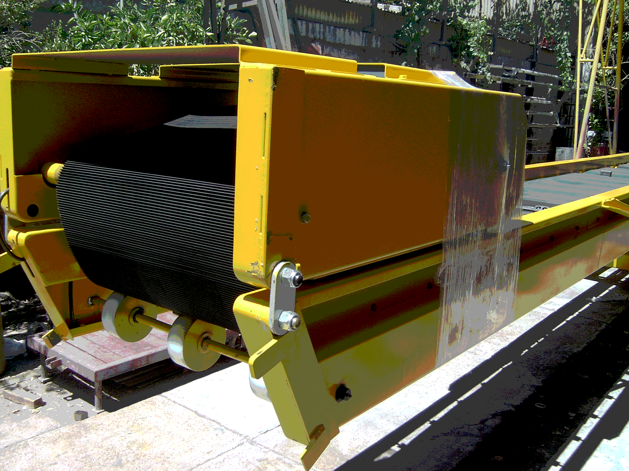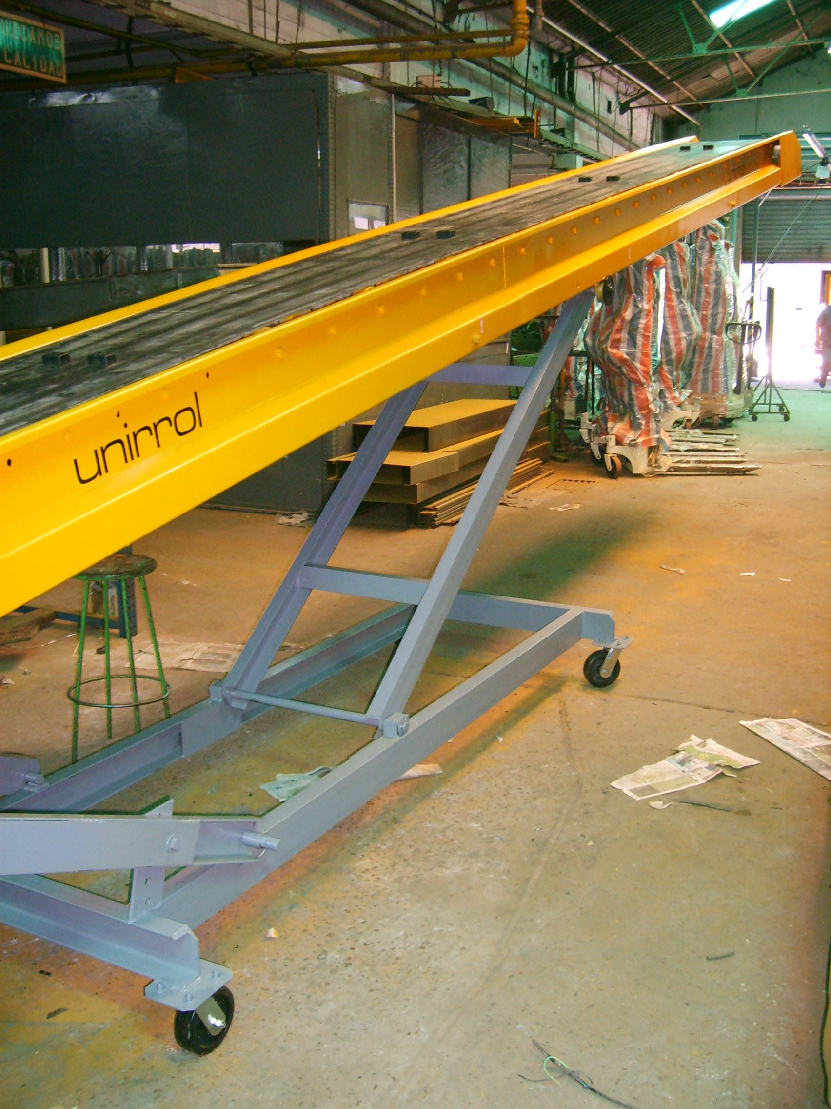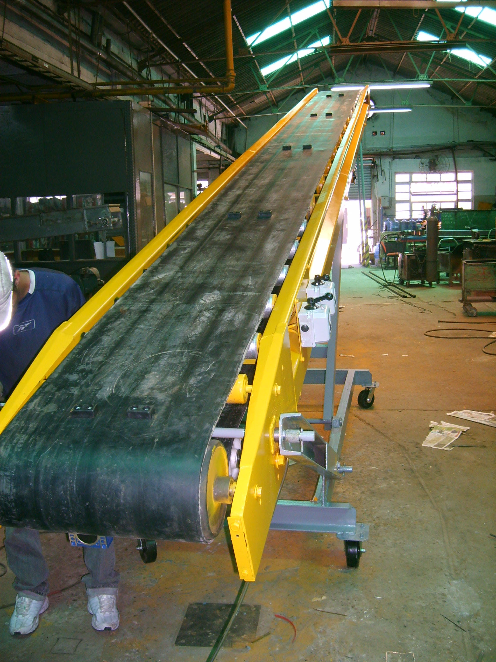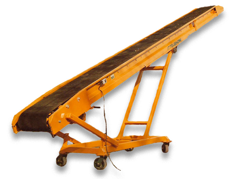 Cintas transportadoras modelo CEB8 de la marca Michelotti. Son muy robustas, especiales para bolsas de hasta 60 kilos. La banda desliza sobre rodillos, ruedas y un sólido bastidor plegado, resistente a los golpes que recibe la cinta al volcar las bolsas.