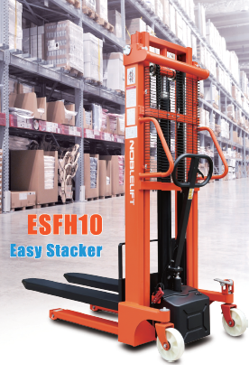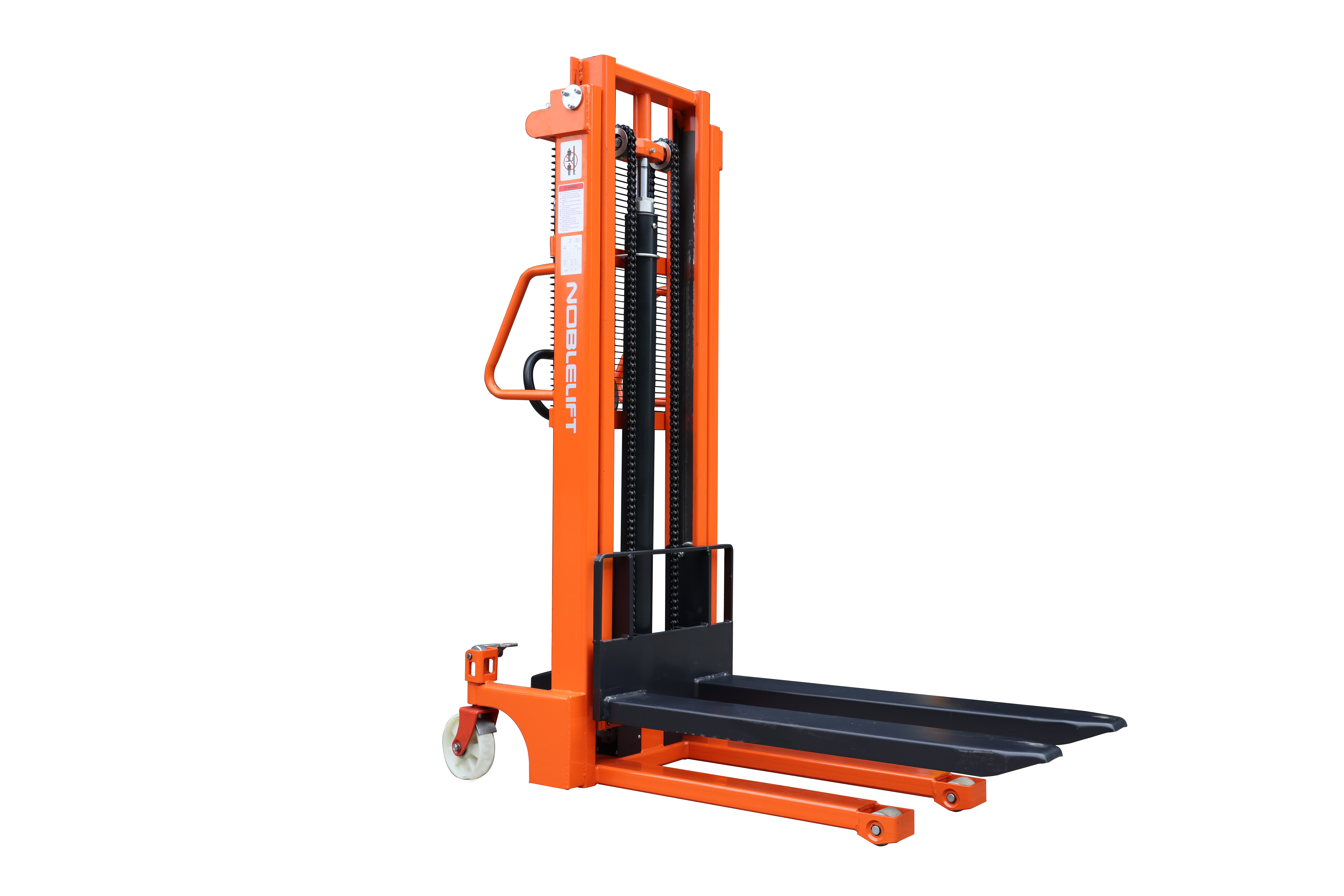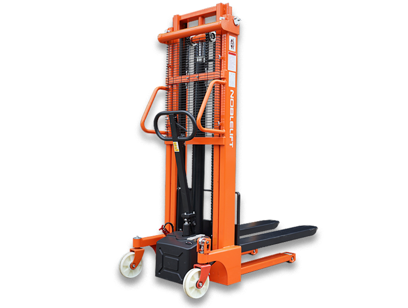 Apilador de elevación electrohidráulica de la marca Noblelift con traslación manual. Capacidad de carga de 1000kg, con opciones de elevación a 1600mm, mástil simple y 2500mm, mástil doble.