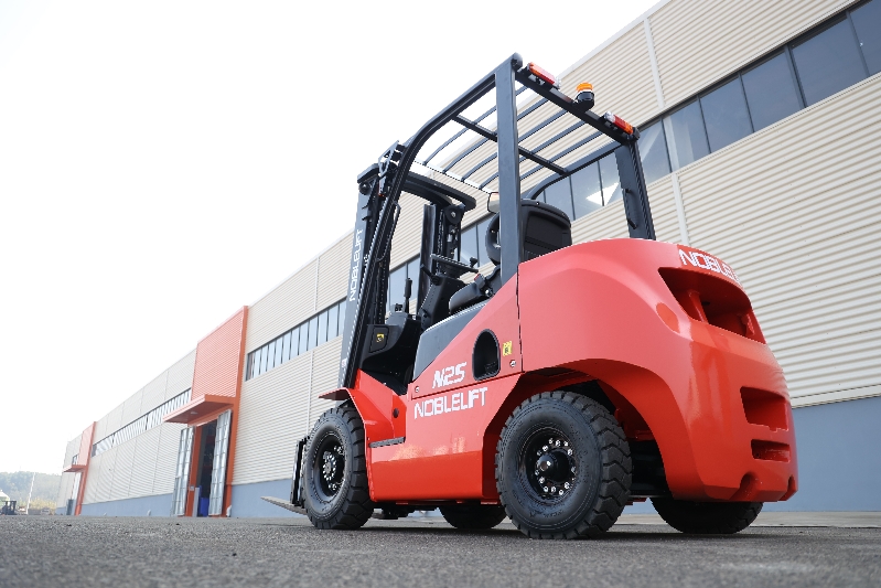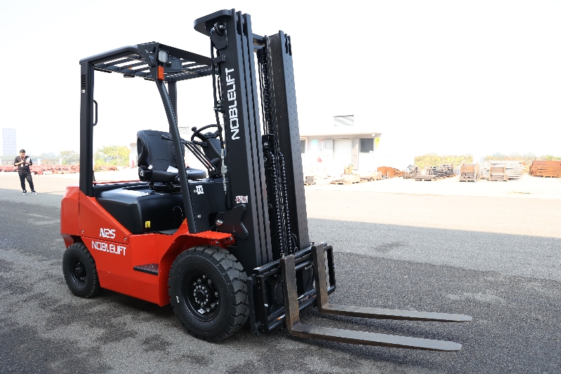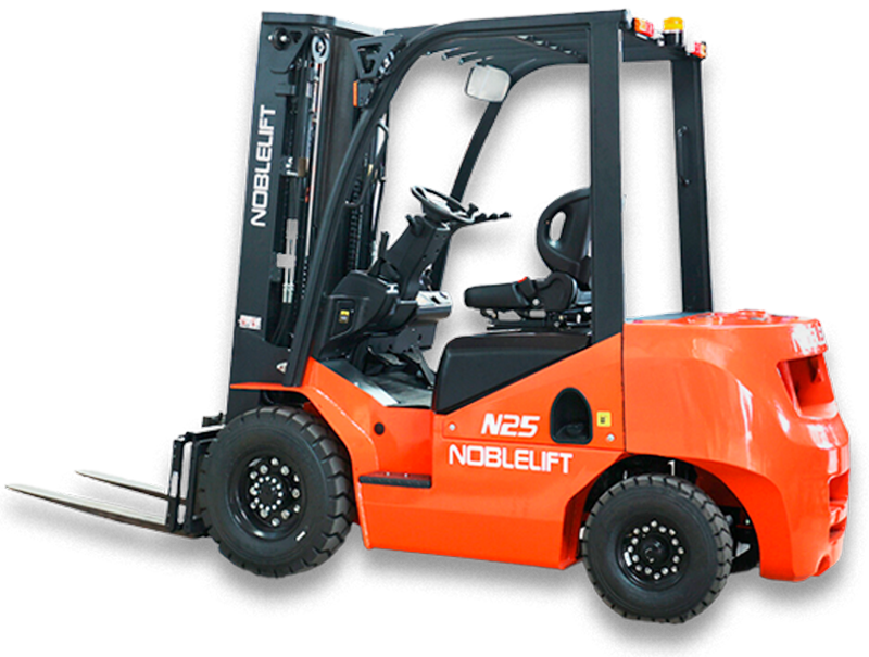 Autoelevadores a combustión Diesel, de marca NOBLELIFT. Excelente visión gracias a su diseño amplio de mástil. Cabina en suspensión, con reducción de la vibración y amplio espacio operativo.