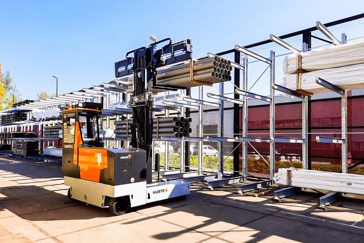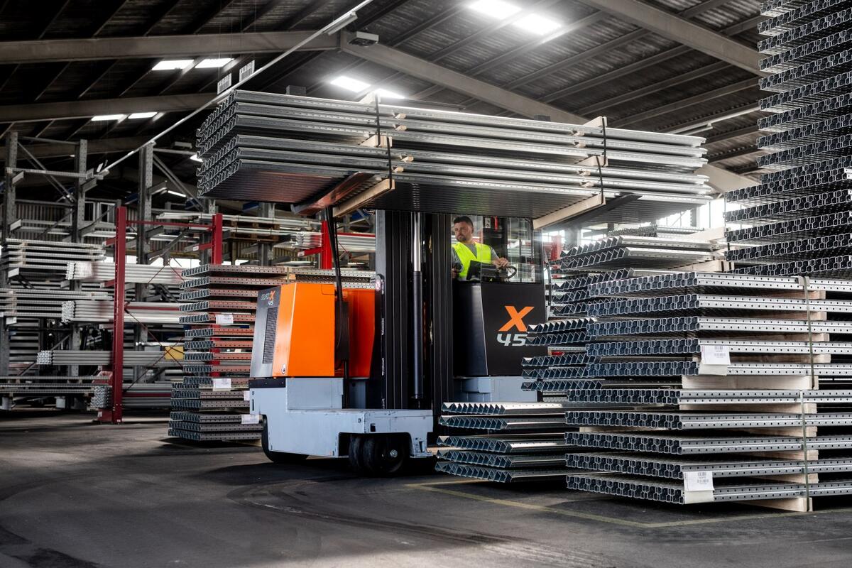 La carretilla elevadora multidireccional MAXX de la gama de acceso económica está disponible en las anchuras útiles y las alturas de elevación más vendidas y se emplea, en particular, para la manipulación de cargas largas en las capacidades de carga de 3000, 4500 y 6000 kg en pasillos estrechos de almacén y para la carga y descarga de camiones en exteriores.
