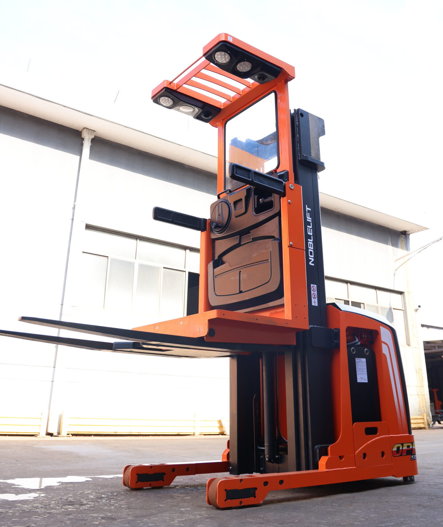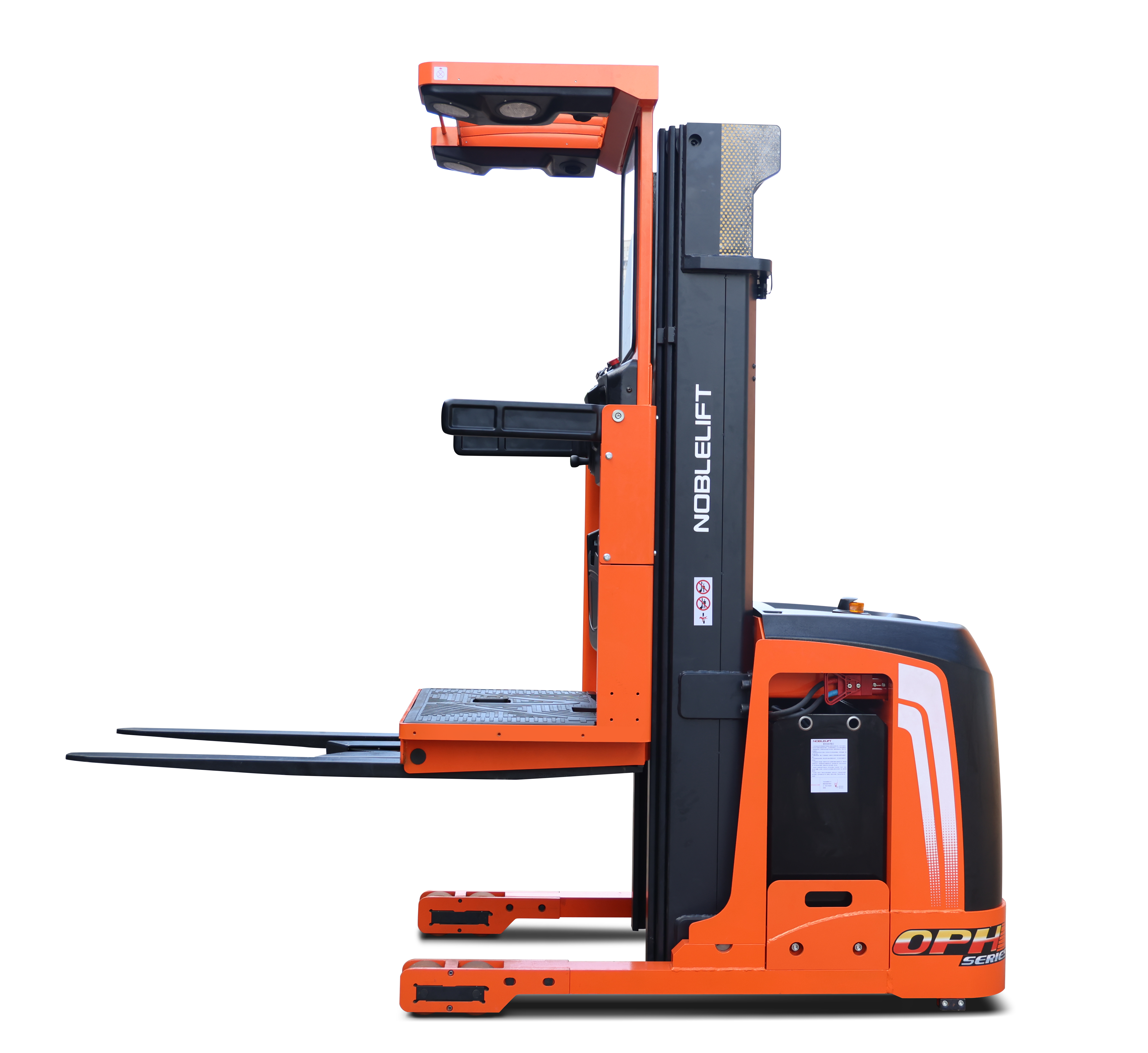 Order picker eléctrica para 1200kilos, de alto rendimiento. De la marca Noblelift, con operario MAN-UP que se eleva junto con la plataforma.