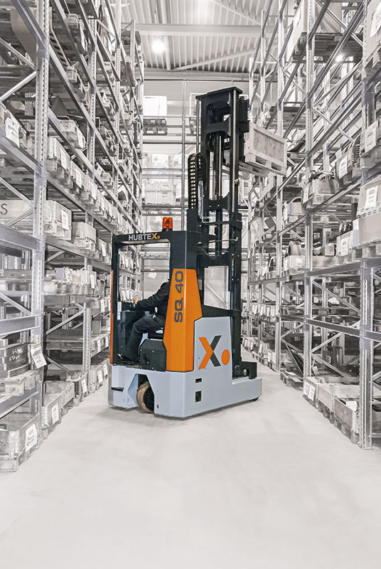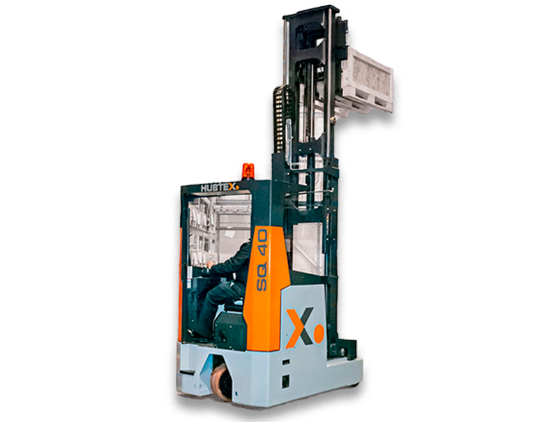 Serie SQ de apiladores reach de carga lateral de la marca Hubtex. Tienen tres ruedas y poseen motor eléctrico. Resultan ideales para movilizar cargas pesadas y compactas en pasillos súper angostos. Es el único modelo en el mundo que resiste cargas de 3 a 5 tn y que ocupa el mismo espacio que los apiladores estándares.